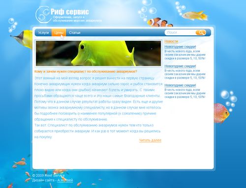 Столько новостям уделено внимания, а весь год одно и тоже висеть будет. "Читать далее" - беэ... Сейчас я так понимаю страница "Статьи" включена, судя по контенту, но не по меню. Фон - не аквариум и даже не вода.