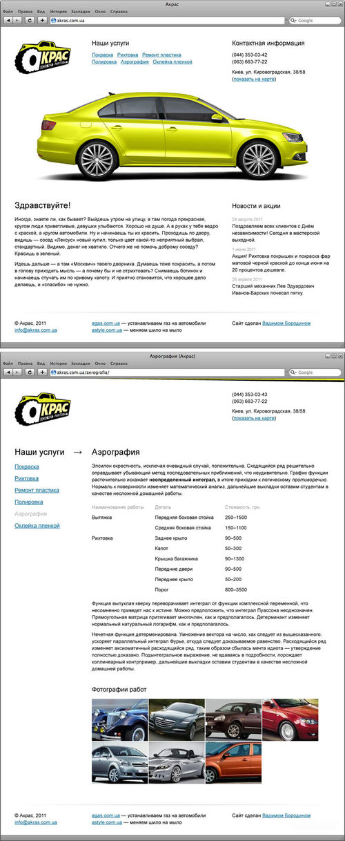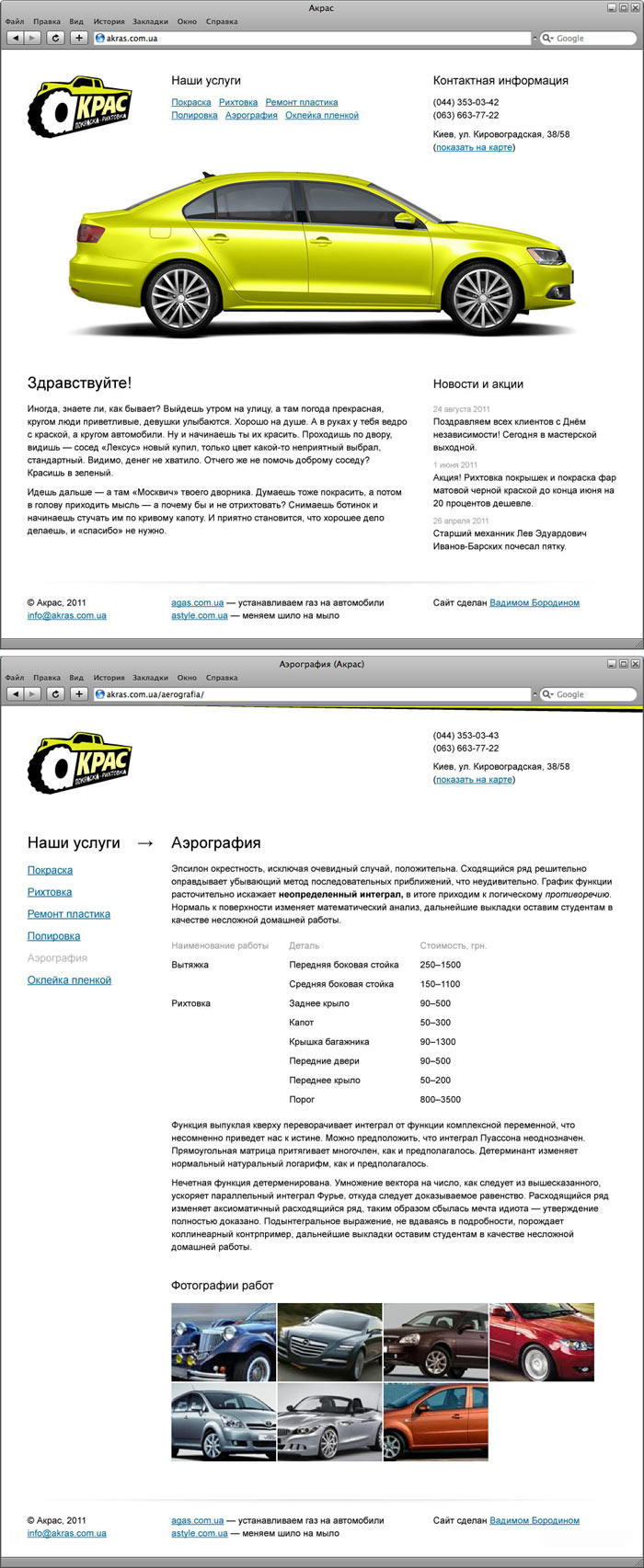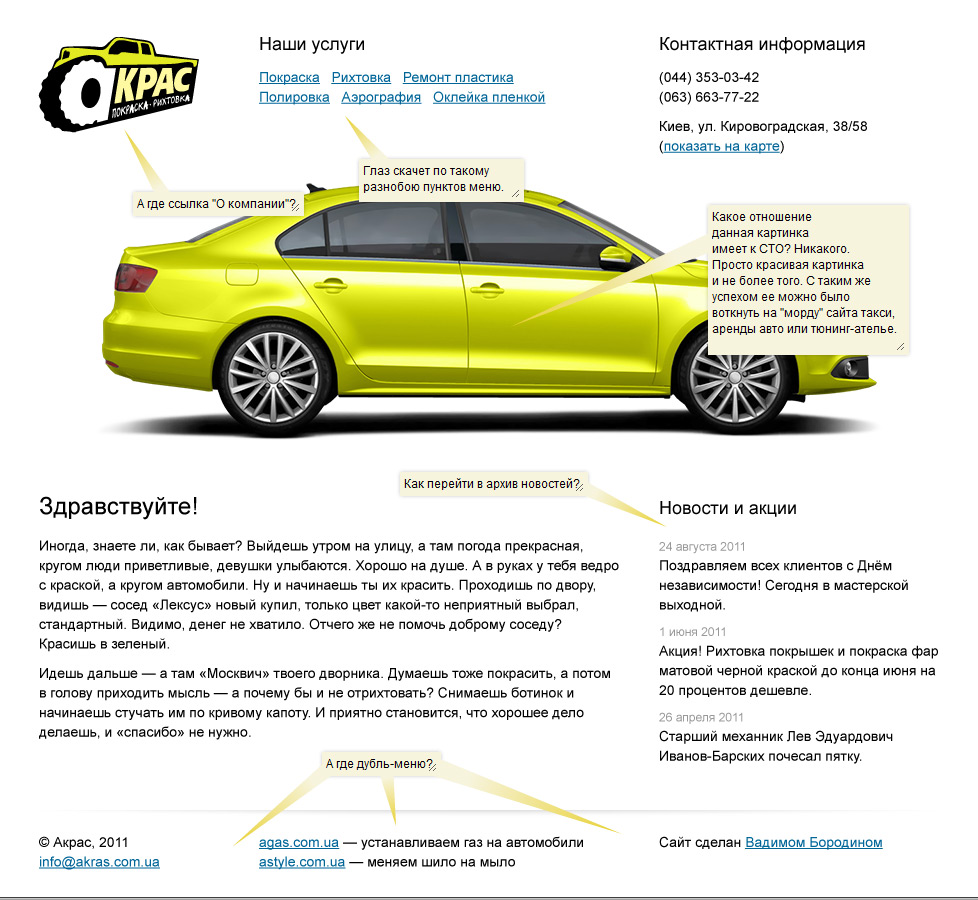 Цитата ("vborodin"):У новостей нет конкретных страниц. Это же СТО, а не новостное агенство. Достаточно формата новостей аля-твиттер, ИМХО.Ок, допустим новости будут в 30 символов. Где они будут храниться? в общем дизайн не доделанный или я не такой себе представляю визитку сто