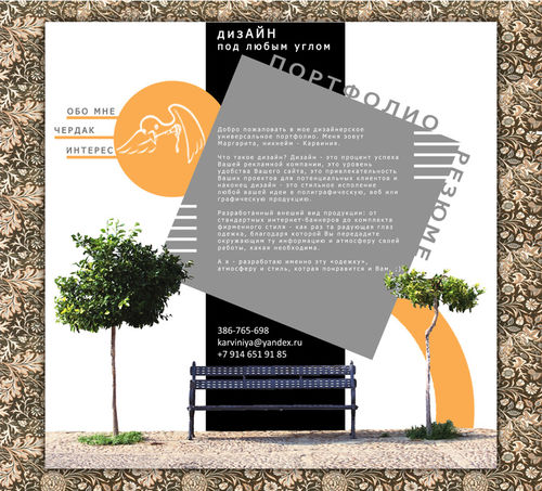 Не обижайтесь, но у Вас получилась каша. Еще и вываленная на коврик.Вот почему: портфолио — это серый квадрат, скамейка и два чахлых деревца в пустыне?