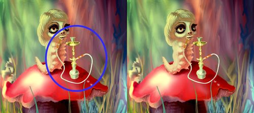 а гриб явно кто то сильно уже покусал... (сама алиса помнится отломила по кусочку с двух противоположных сторон окружности, то есть слева и справа относительно гусеницы)