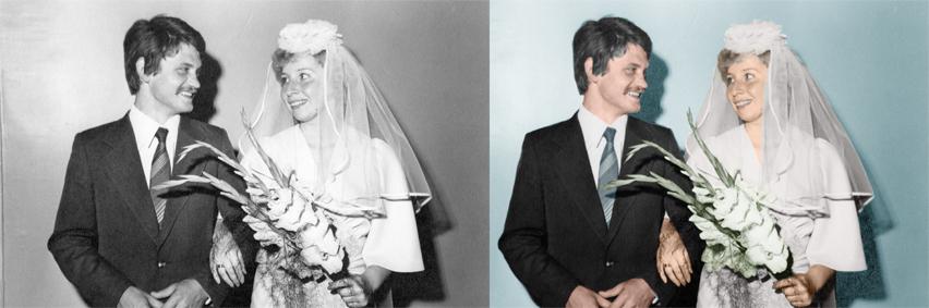 Лучше взять цветное фото и посмотреть цвет кожи( по мне - жених слишком розовый для мужчины), цветов.... и повторить