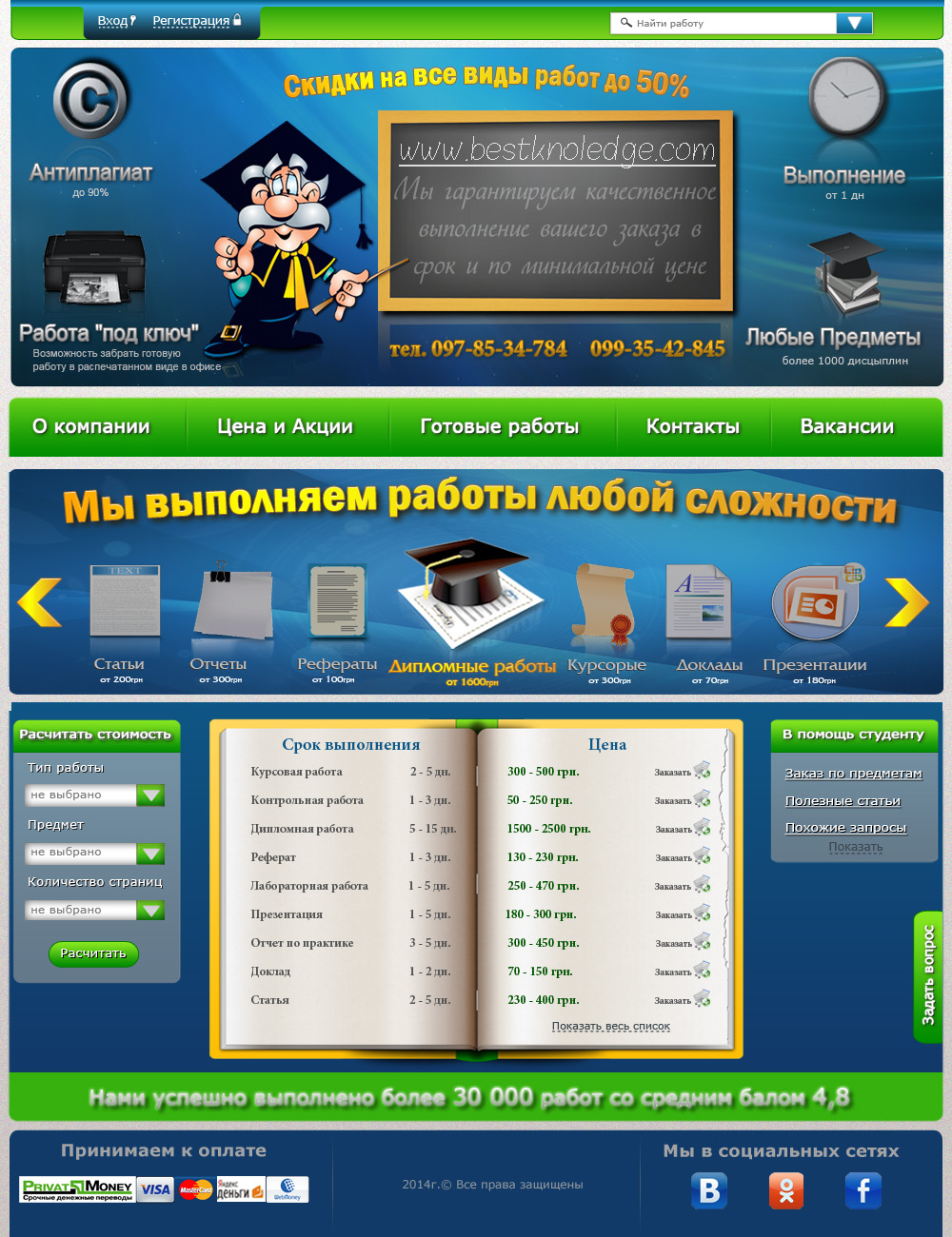 Я, как человек, отдаленно знакомый с веб-дизайном позволю себе высказать мнение. Разные шрифты, стили, эффекты, клип-арты вперемешку. Нарисуйте собственные пиктограммы в единой стилистике. Картинки для "Статьи", "Отчеты", "Рефераты" и пр. представляют собой листы бумаги, ничего в себе не несущие, так что не нужны. Усатый дядька и доска, книга в центре - не нужны. Надпись "нами успешно выполнено..." плохочитаема. Высоту блока с дядькой можно уменьшить в три раза. Надписи, выгнутые дугой - первое, что бросилось в глаза. Ну и орфографические ошибки "Курсорые", "Расчитать".