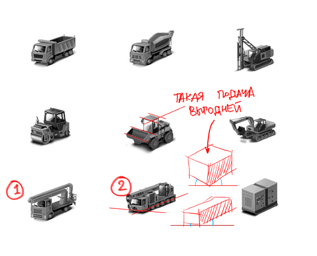 Вообще смотрятся хорошо.В третьем раду - два левых грузовика,кабина сильно развёртнула к зрителю.