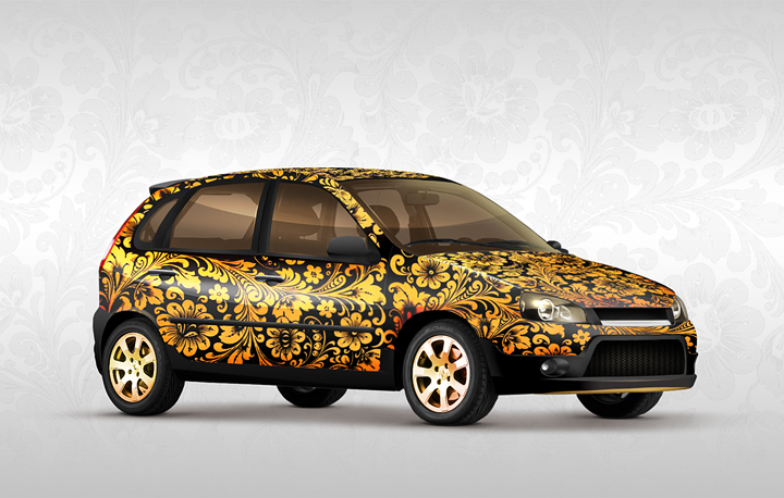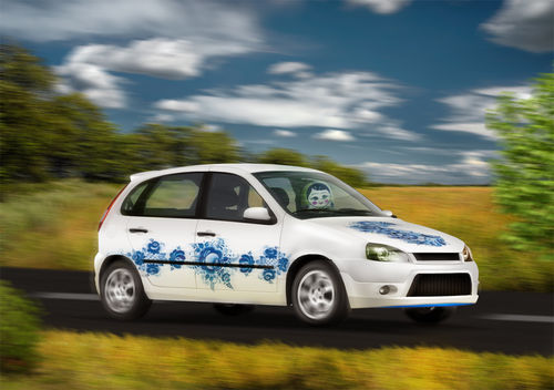 Ну а в целом — не понятно зачем Вам то гжель, то хохлома... Нового в этом ничего нет. По Питеру, например, волга такая ездит. И на остеклении блик неверный, получается кузов плоский.