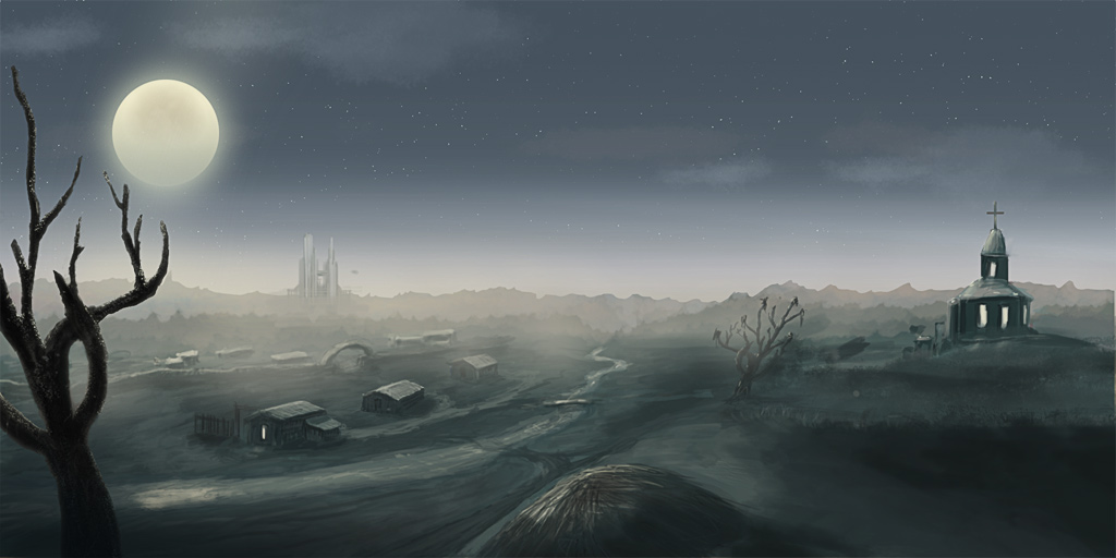 Класс. Я тоже хочу так неуметь рисовать . Как-то зловеще всё это выглядит. Правда, на мой взгляд, было бы круче без света в домике и часовне.