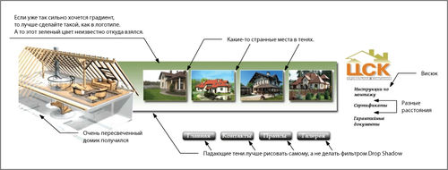 YuraH345, Главный недостаток — нет единства стиля. Полуразобранный домик; фотографии, на которых больше показаны сами здания, а не крыши (я так понял, что сайт именно про кровли?); меню оторвано от общей картинки и зачем-то разбито на две несвязанных части (одна часть — черные кнопки, другая — написана курсивом справа), ничем не оправданный градиент на прямоугольнике с фотками и т. д. И все эти элементы сделаны совершенно в разной манере, и выглядит это не очень.(((