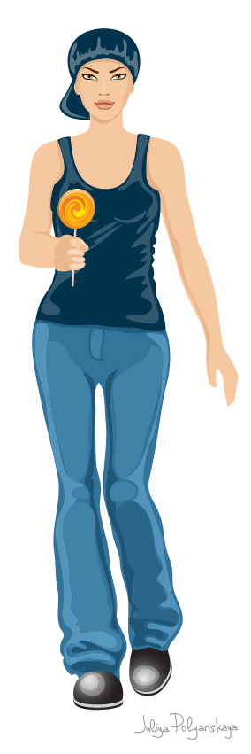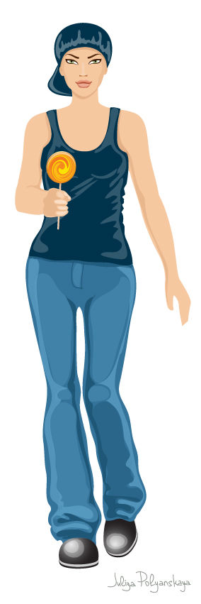 Всё хорошо , но у неё выражение на лице как будто она с пистолетом стоит, и целится на своего не верного приятеля, к леденцу такое выражение на лице не подходит-как по мне...верните девушке пистолет :P Грудь по естественней- объём груди нормальный сама грудь маленькая, сверху в обще нет её признаков, и ботинки по симпатичней или по меньше, а то левый как-то носок на ботинке очень большим кажется.На счёт волос тоже думала, но тут как бы кепка низко посажена- линию роста волос при таком раскладе не видно будет, из других мест тоже если правильно уложить волосы как под парик, то не видно их будет.