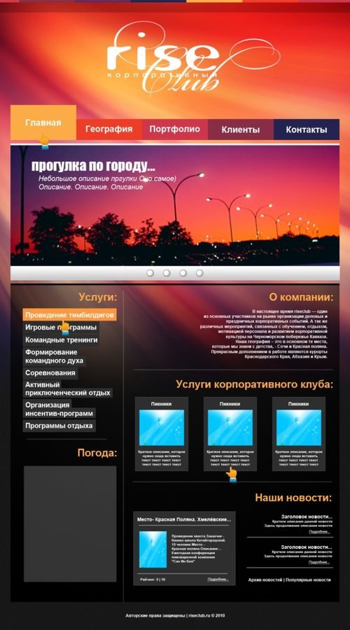 Этот дизайн на конкурсную работу был сдан. Компания занимается проведением корпоративных отдыхов. То есть я бы хотел, чтобы вы оценили макет в целом. Как он смотрится в Ваших глазах. Мне кажется, что чего-то не хватает. Не могу понять чего...