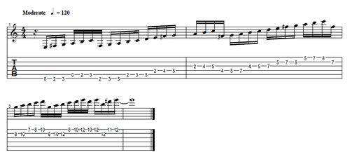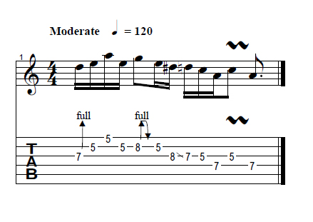 и техники требуют они ну никак не меньше...Цитата ("epavlovich"):Смотрите: у вас в руках гитара, с хорошим сустейном, типа леспола. И вот вы играете элементарную комбинацию, изображенную на рисунке. И выясняется, что «правильно» ее не сыграть, потому как открытые струне при бенде начинают дребезжать (нужен большой палец для заглушки), а после пулов начинают дребезжать нижние, и нужно правую руку положить на струны. Если сыграть это дело классическим образом — будет сплошная грязюка.