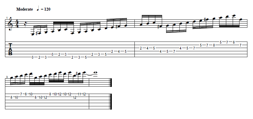 Я продолжаю утверждать: отсутствие правильной (продуманной, обоснованной, эргономичной) постановки (осанки, положения, звукоизвлечения) - рано или поздно приведет к невозможности дальнейшего развития.Смотрите: у вас в руках гитара, с хорошим сустейном, типа леспола. И вот вы играете элементарную комбинацию, изображенную на рисунке. И выясняется, что «правильно» ее не сыграть, потому как открытые струне при бенде начинают дребезжать (нужен большой палец для заглушки), а после пулов и вибрато начинают дребезжать нижние, и нужно правую руку положить на струны. Если сыграть это дело классическим образом — будет сплошная грязюка.