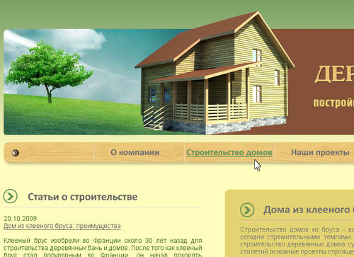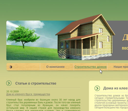 По цветовой гамме, чисто из личных ассоциаций, мне кажется, дома из дерева предполагают некую экологичность или природность. кусочек луга с деревом на это намекает. а вот фон каких-то мутноватых серо-зеленых оттенков с экологичностью не вяжется. да и серые оттенки традиционно больше ассоциируются с чем-то техногенным. мне кажется, можно было бы подобрать какие-то более чистые цвета для фона. чтобы возникало ощущение свежести и теплоты, которое бывает в деревянных домах.