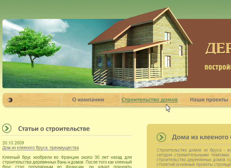 По цветовой гамме, чисто из личных ассоциаций, мне кажется, дома из дерева предполагают некую экологичность или природность. кусочек луга с деревом на это намекает. а вот фон каких-то мутноватых серо-зеленых оттенков с экологичностью не вяжется. да и серые оттенки традиционно больше ассоциируются с чем-то техногенным. мне кажется, можно было бы подобрать какие-то более чистые цвета для фона. чтобы возникало ощущение свежести и теплоты, которое бывает в деревянных домах.