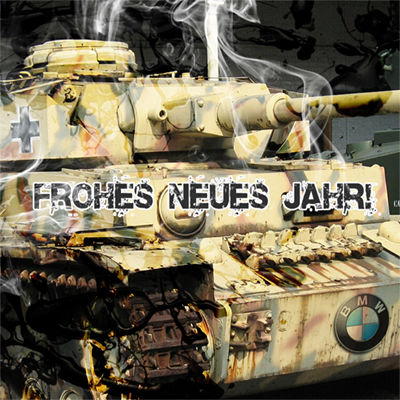 Я кажется понял. Автор хотел изобразить - Новый Год, автосалон, дым, смолу, крест, танчик бмв и пятна.