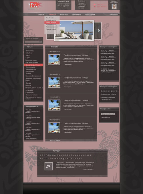 Сайт сети магазинов в сфере туризма и отдыха. Тему дизайна заказчик определ сам (цвет тёмный, тема природная, клипарт из малозийских стилизованных рисунков предоставил, лого тоже уже было)