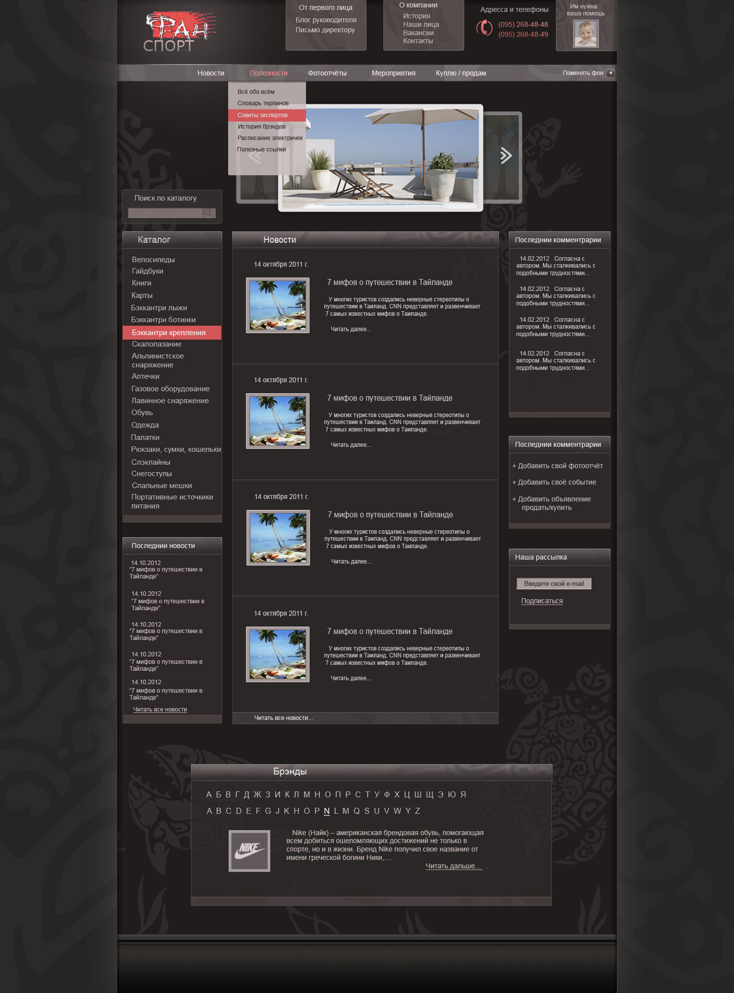 Сайт сети магазинов в сфере туризма и отдыха. Тему дизайна заказчик определ сам (цвет тёмный, тема природная, клипарт из малозийских стилизованных рисунков предоставил, лого тоже уже было)