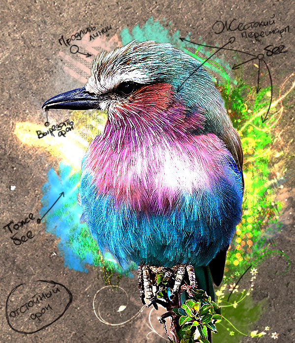 Опять грязный фон, перешарп, тень какая-то вылезла под птицей, она не должна такой быть...