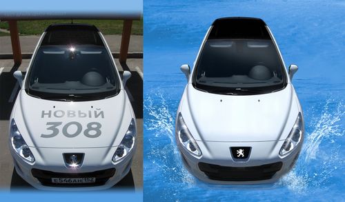 Если машина плывет, где след на воде за машиной? Если она падает в воду и только коснулась поверхности - угол не тот. Перед самым носом машины, вода гладкая, спокойная - так не может быть. И непонятное что-то с крышей/салоном. Сейчас и не поймешь, то ли это кабриолет с черными креслами, то ли крыша черная. Бликов можно добавить, при таком ярком освещении они должны быть.