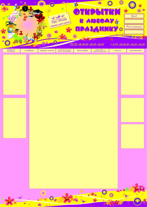 Яркий и позитивный товар, выставленный в вашем ярком и позитивном "дизайне" тупо потеряется.Если хотите сделать акцент на открытках, к дизайну сайта следует отнестить по принципу контраста, т.е. очень просто и минималистично, чтобы ничего не отвлекало от открыток.