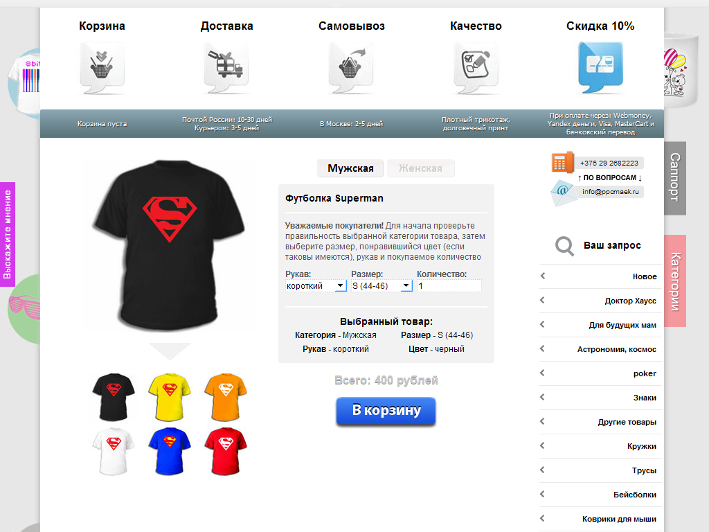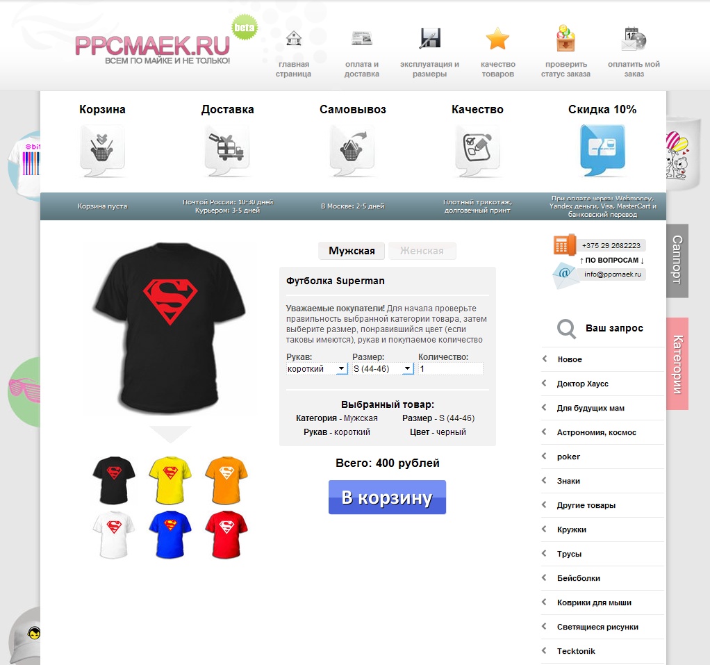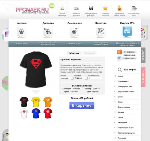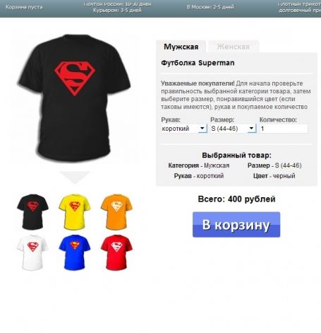MaxPro, было бы хорошо, если б вкладки мужская женская были бы проиллюстрированы маленькими фигурками.Название футболки и заголовок "Выбранный товар" одним стилем, мне кажется это нужно исправить. Да и ровнение у Вас то по левую сторону, то по центру. В некоторых местах это смотрится неаккуратно.