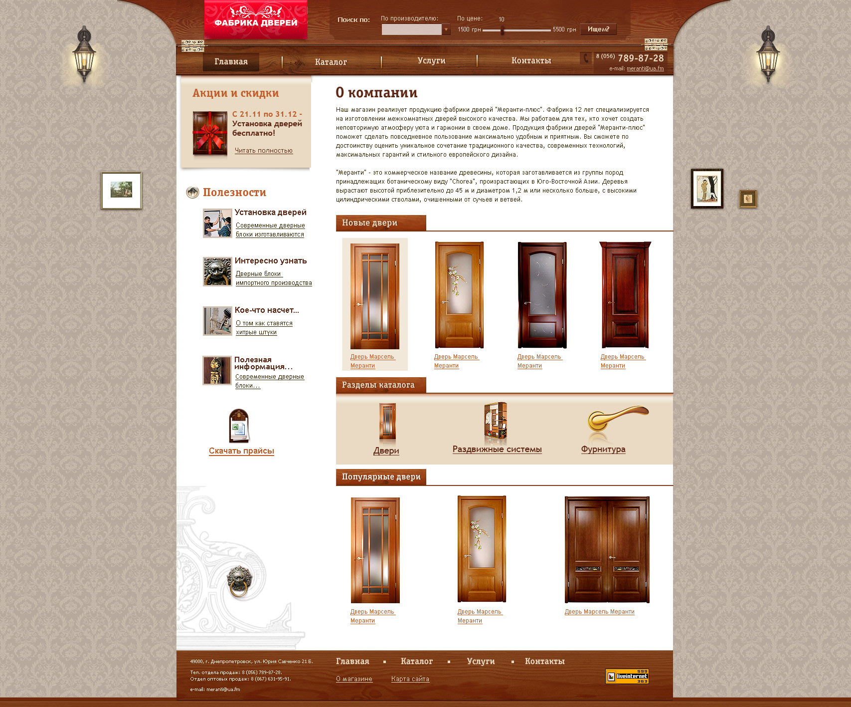 Вот искала я по интернету такие двери себе в квартиру, выбрала у тех, у кого были дешевле, а дизайн сайта у них был страшненький )))В сайтах такой тематики главное структура, быстрый и понятный доступ к каталогу и ценам, а по главной странице судить трудно, но в целом у вас получилось как-то даже уютно
