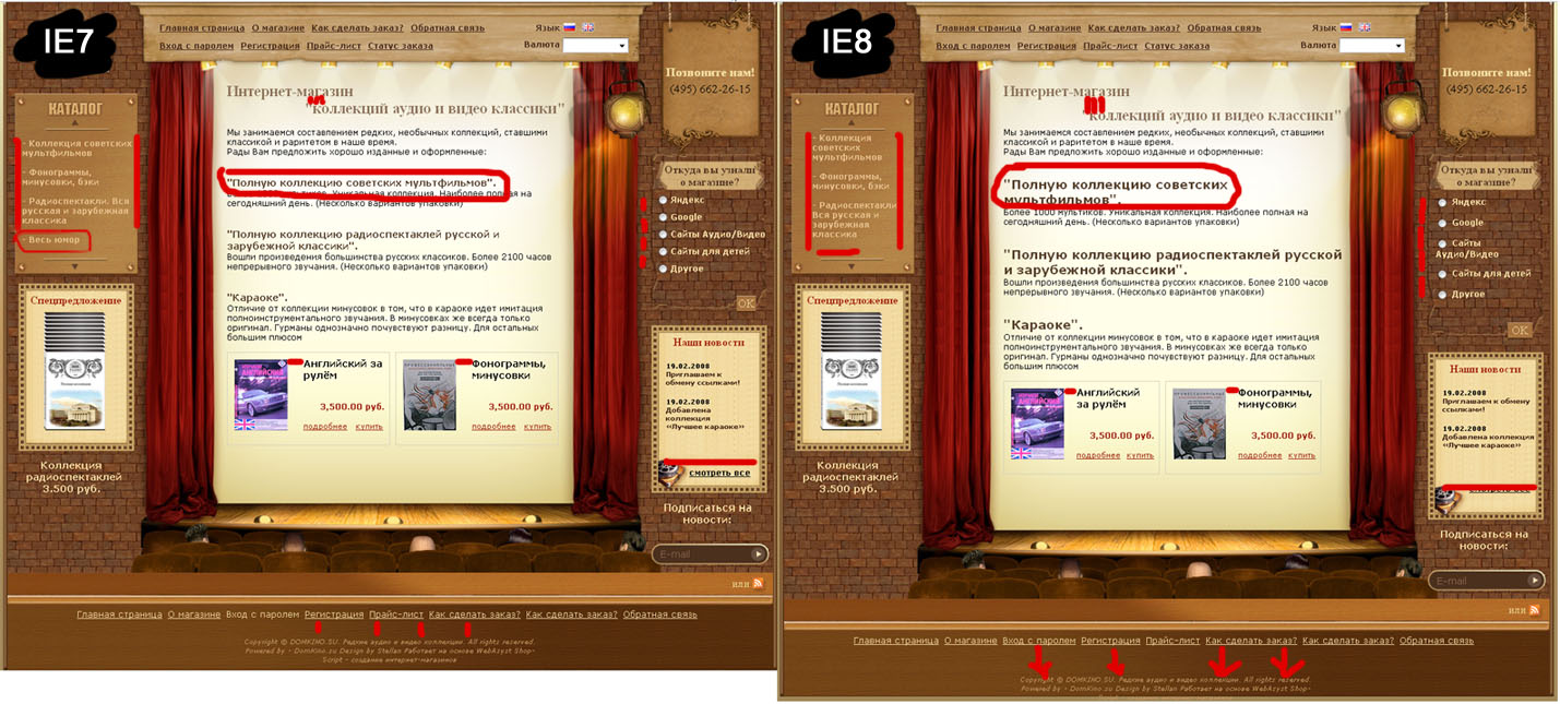 romashov, ну это вот в IE7 и в IE8 по-быстрому стравнил. Отметил красным самые большие ошибки. Там и в IE6 еще смотреть нужно.