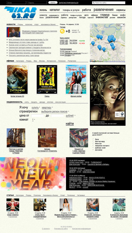 Говоря „на скорую руку” — если сайт тесно связан со всем происходящим в Рязани, то глобальные новости можно и по глубже запихнуть, их без того на каждом сайте как г... по весне. А вот логотип... Логотип... Это не логотип у вас... «Хрену к нему не хватает...» Ни кернинга, ни логики, ни выразительности. Пф...