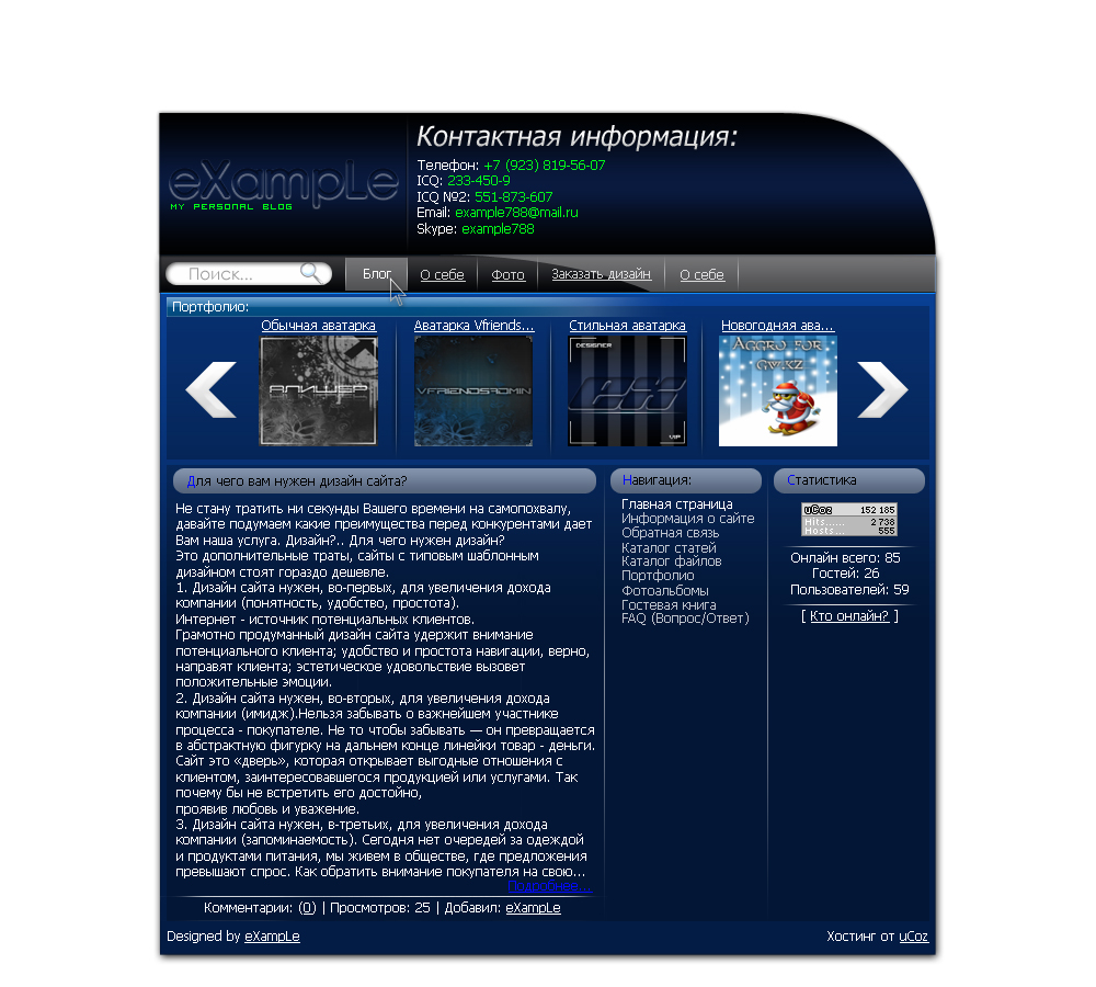 3. Не знаю... Может у Вас рыба в меню и навигации, но смотрите сами: вверху "О себе" - 2 раза; портфолио пусть будет на всех страницах такой вот полосой, зачем еще и в навигации?; зачем гостевая? Обычно в блоге можно комментарии писать. Тоже самое; если Вы в шапке написали все виды связи, зачем обратная связь? Сделайте ссылки на почту в шапке - и всё; "Блог" и "Главная страница" - думаю в Вашем варианте равносильны - дубляж.