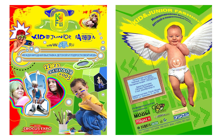 -левая часть, не имеет композиционного центра, если целью было заявить о самой междунарожной выставке, то цель провалилась - текста не видно, а остальные элементы бессмысленно разбросаны по полю. хаос - тоже имеет свою логику, в данном случае ее нет.