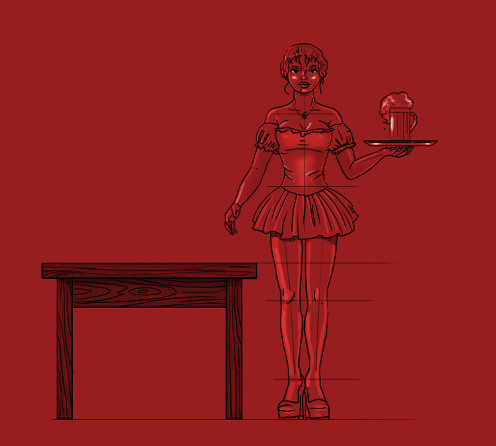1 . Девушка с подносом, ростом, ну пускай будет метр семьдесят пять с каблуками.