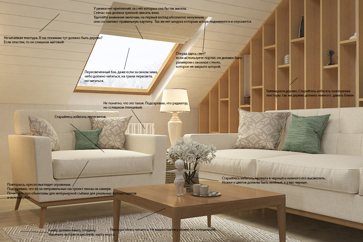 Так же стоит почитать о настройках камеры, особенно то, что касается линз и искажения перспективы. К примеру это многострадальное кресло, на прямом ракурсе выглядит вполне нормально, на первом огромное. 100% это из-за искаженной перспективы.