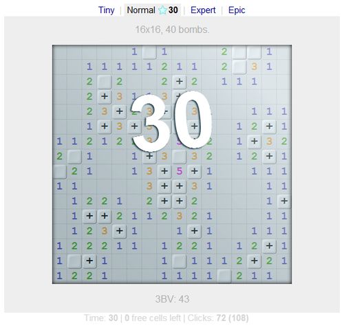 Цитата:MatArt, смысл в том, что вокруг единицы только одна бомба, вокург 2-ки - только две бомбы и т.д., цифра означает количество бомб вокруг цифры. Если посмотришь на скрины, то там видна эта закономерность. Тоесть, если вокруг 1-ки уже есть одна бомба, то все остальные неизвестные клеточки можно открывать смело. Так и играешь, пока не разгадаешь все.Если играть основываясь только на этих частных случаях - выиграть можно только на очень простых "раскладах".