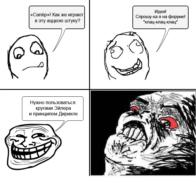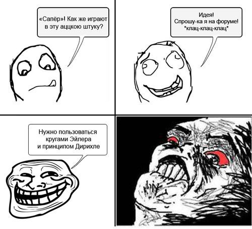 Цитата ("MatArt"):Никогда не понимал как играть в эту штуковину. но сделано прикольноНужно пользоваться кругами эйлера (цифры это и есть характеристика круга) и принципом Дирихле =)