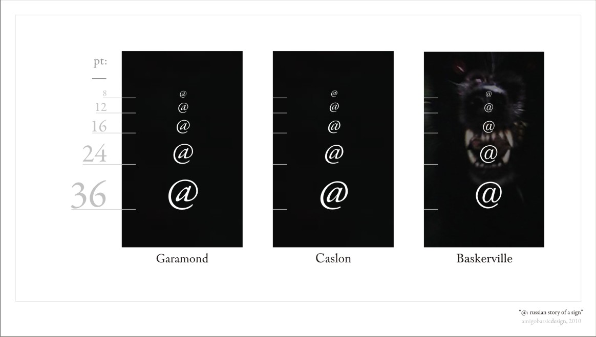 Цитата ("shrikes"):И где история. Эти 3 шрифта, что вы использовали, по-моему, к русским никакого отношения не имеют.Да, не имеют. Шрифты не русские, но русифицированы и используются нами; знак "@" - не русский, но используется повсеместно и называют его "собака" только русские. Но слова Гарамон и Кэзлон у русских никаких ассоциаций не вызывает. А Баскервиль - вызывает. Вот это стечение обстоятельств я и хотел показать в работе.