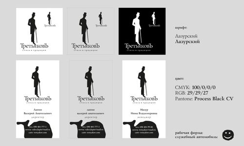 epavlovich, пасибо за помощь по шрифту! Строчными ФИО - это я уже прикалываться начал. ) По поводу нижней части визитки я не уверен, что персонаж в виде "сверху" будет различим (именно одним цветом и объемом если его делать). Я его не рисовал еще, но мысленно в голове прорисовывается просто пятно. А уже когда на других носителях стиля его увидят более детализироанным (с прорисованной шляпой, тростью, обувью, и т.п.) - тогда только поймут, что на визитке за пятно. Вот на это рассчитываю.