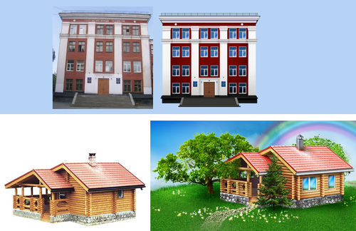 По вопросу обрисовки и ретуши так: первая работа — тысяч так 2–2,5 (сужу по фото, а не по конечному результату); домик, если нужно было бы именно обрисовать, а не сделать фотомонтаж с ретушью — где-то 4 тыс. руб., не меньше.