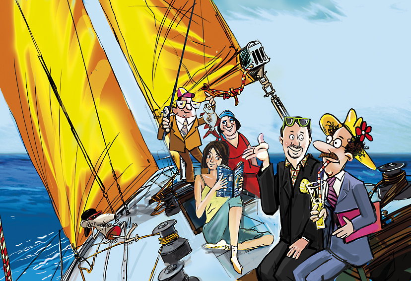 Хоть это и комикс, но не совсем ясно сидят ли люди на корме парусника или они сидят на горке какой-то насыпи. Нога у девушки с газетой сливается с цветом того места на котором она сидит, у девушки с газетой взгляд бы по более радостный))))))))) А так супер!