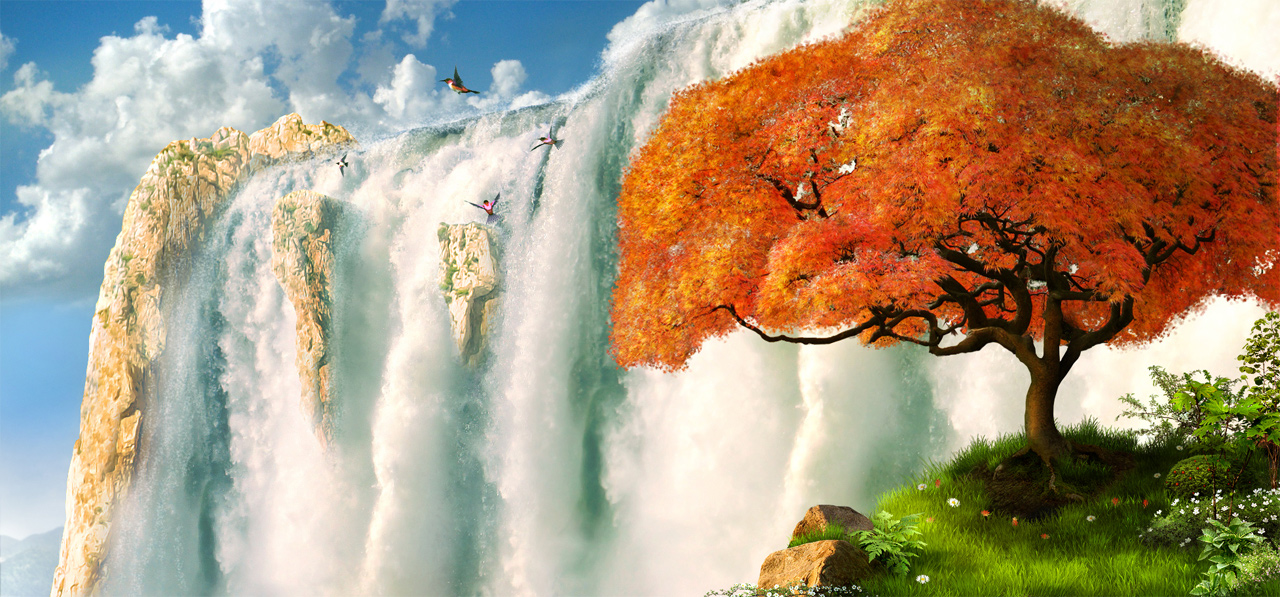 Как по мне листья с левой стороны дерева обрезаны и не гармонируют с водопадом,плюс скалы у водопада должны быть скорее острее и под таким сильным напором зелень наврядли там будет рости...