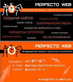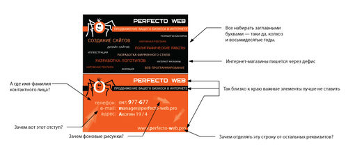 Цитата ("PerfectoWeb"):Так вопрос: в чем включается КРЕАТИВНОСТЬ и ИНДИВИДУАЛЬНОСТЬ визитной карты?Пока Вы будете считать, что визитка должна быть креативной и индивидуальной — вот до этих самых пор у Вас не получится сделать нормальную визитку. Сейчас она откровенно паршивая, извините. Встречный вопрос: а что такое КРЕАТИВНОСТЬ и ИНДИВИДУАЛЬНОСТЬ, и зачем они нужны визитной карточке?
