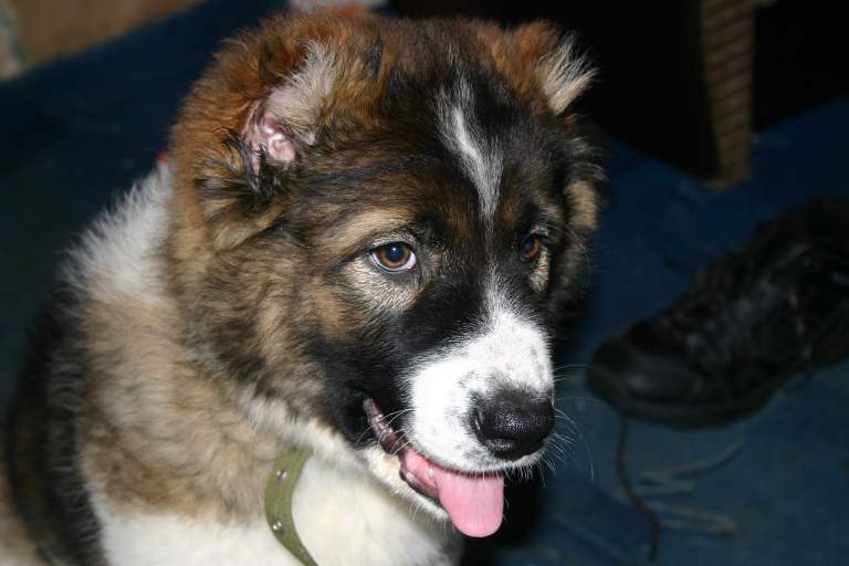 А это щенок, её всего 3 месяца, купил после того как погиб предыдущий кавказец был кобель 80 кг весу, и полностью подчинялся дочке ( у которой 20 кг