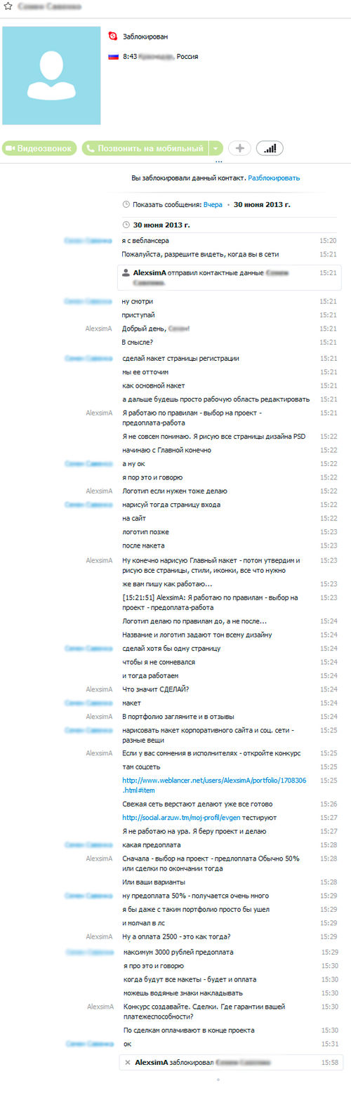 Вот разговор в скайпе - имя я замазюкала, проект открыт... Конечно - самое простое - видишь такое - проходи мимо. Но мне обидно, почему из фрилансеров постоянно делают лопухов? Сколько можно такое терпеть и как таких выявлять и пресекать...