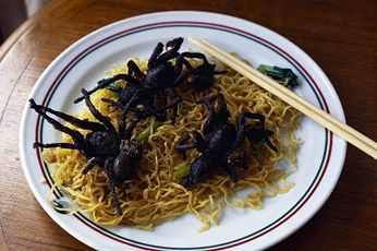 Обжаренные до черноты тарантулы, похожие на лакированные обугленные головешки, — распространенная уличная еда в Камбодже. Удачливый ловец тарантулов в день может поймать до двухсот особей. Продаются они очень быстро. Камбоджийских тарантулов обжаривают в воке с солью и чесноком — на вкус их мясо напоминает нечто среднее между курицей и рыбой.