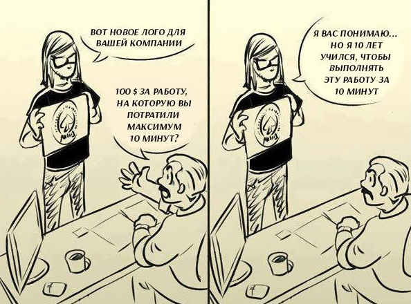 greyheart, если человек говорит "Хочу 2 окружности, шрифт с засечками, цвета - бесик", это не значит, что он знает, чего хочет.Соответственно, и с таким ТЗ логотип может стоить 50 баксов.