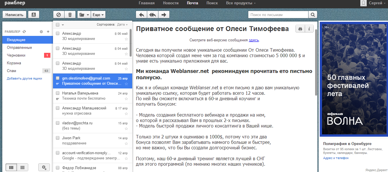 Создала тему тут, только потому, что ящик на который пришло письмо, используется мной исключительно для работы с Веблансер
